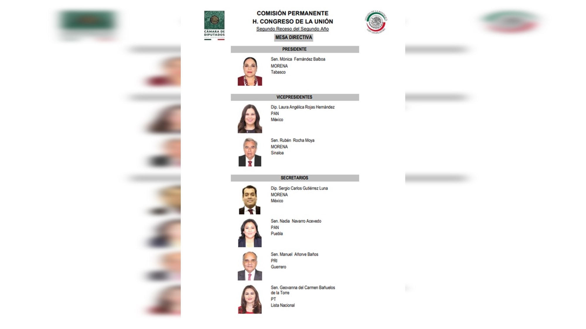 PD10.- Por cierto, en el primer receso del segundo año de ejercicio del Congreso de la Unión la integración de la Comisión Permanente, es como sigue: senadora Mónica Fernández Balboa, de Morena, como presidenta; diputada Laura Angélica Rojas Hernández -del PAN- y el senador de Morena Rubén Rocha Moya, de Morena, como vicepresidentes, y como secretarios el diputado Sergio Carlos Gutiérrez Luna de Morena; la senadora Nadia Navarro Acevedo, del PAN; el senador Manuel Añorve Baños, del PRI, y la senadora Genoveva del Carmen Bañuelos de la Torre, del Partido del Trabajo como secretarios.
