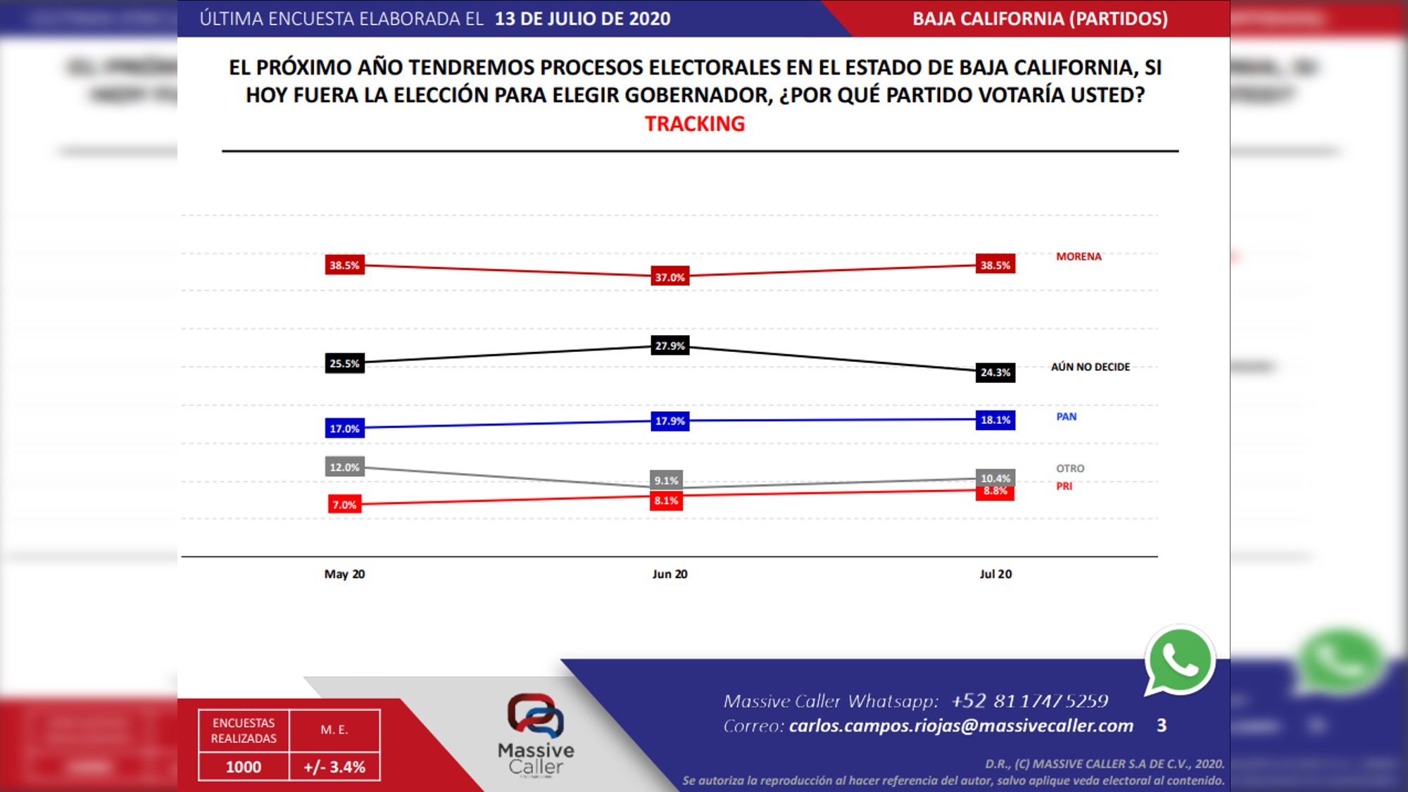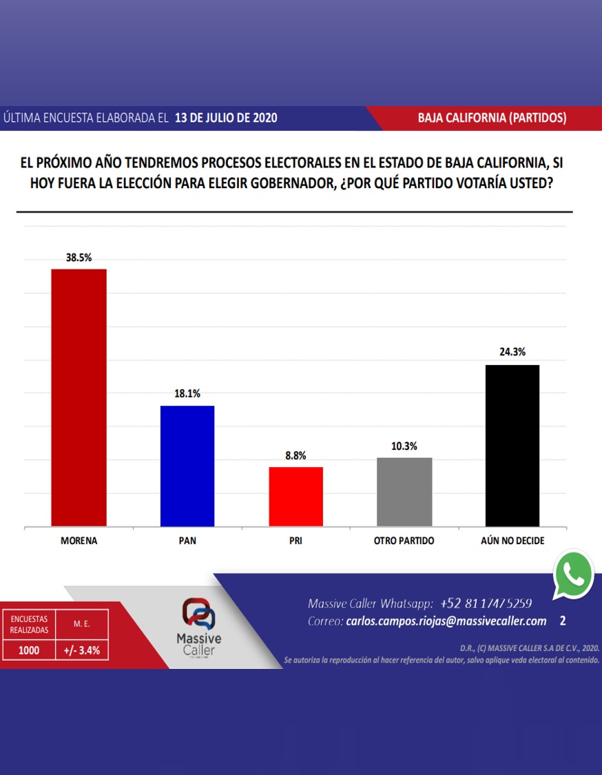 Vamos a utilizar de nueva cuenta el sondeo que Massive Caller hizo con respecto a la gubernatura de Baja California, sobre todo porque los números son los más recientes, al haberse elaborado la encuesta el 13 de julio de este año, o sea, apenas hace dos días.