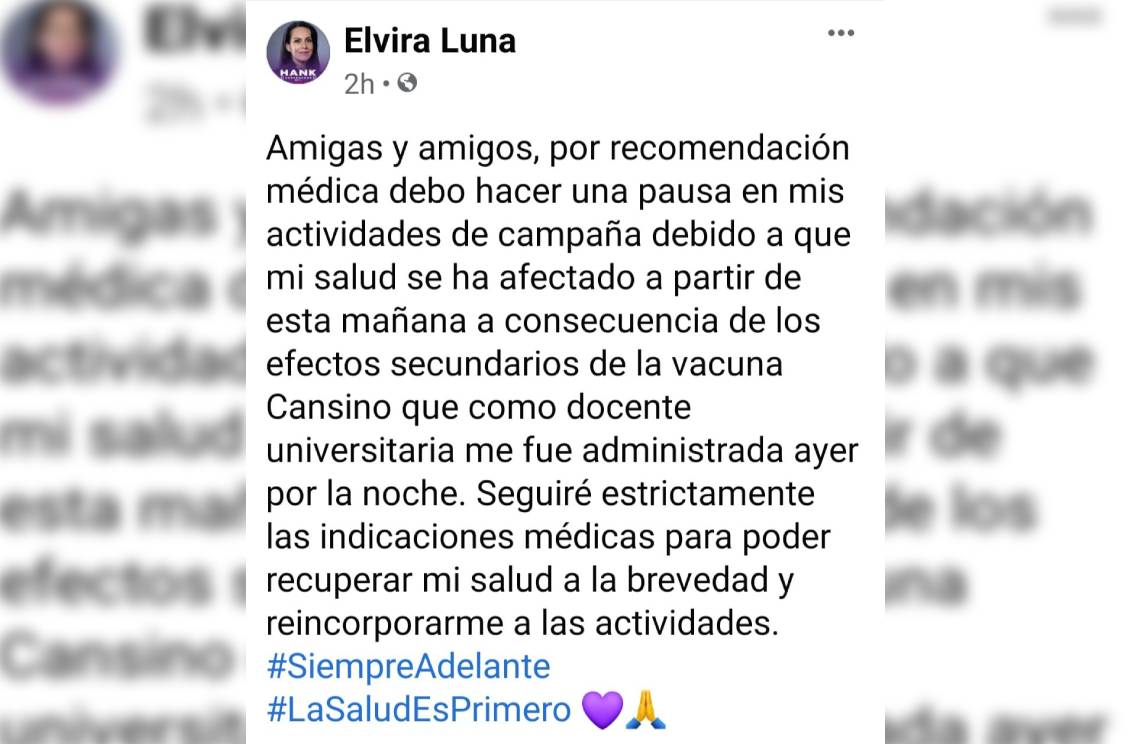 Finalmente, por si algo les faltara, ahora la candidata del PES en Mexicali, Elvira luna Pineda, argumentando sentirse indispuesta por la aplicación de la vacuna CanSino que, como maestra universitaria que es, le aplicaron, señaló que debe hacer “una pausa” en sus actividades de campaña.