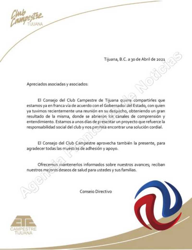 Comentó que, muy posiblemente, para la próxima semana podría tenerse ya un documento con los acuerdos a los que habrán de llegar la directiva del Club Social y Deportivo Campestre y el gobierno a cargo de Bonilla Valdez.