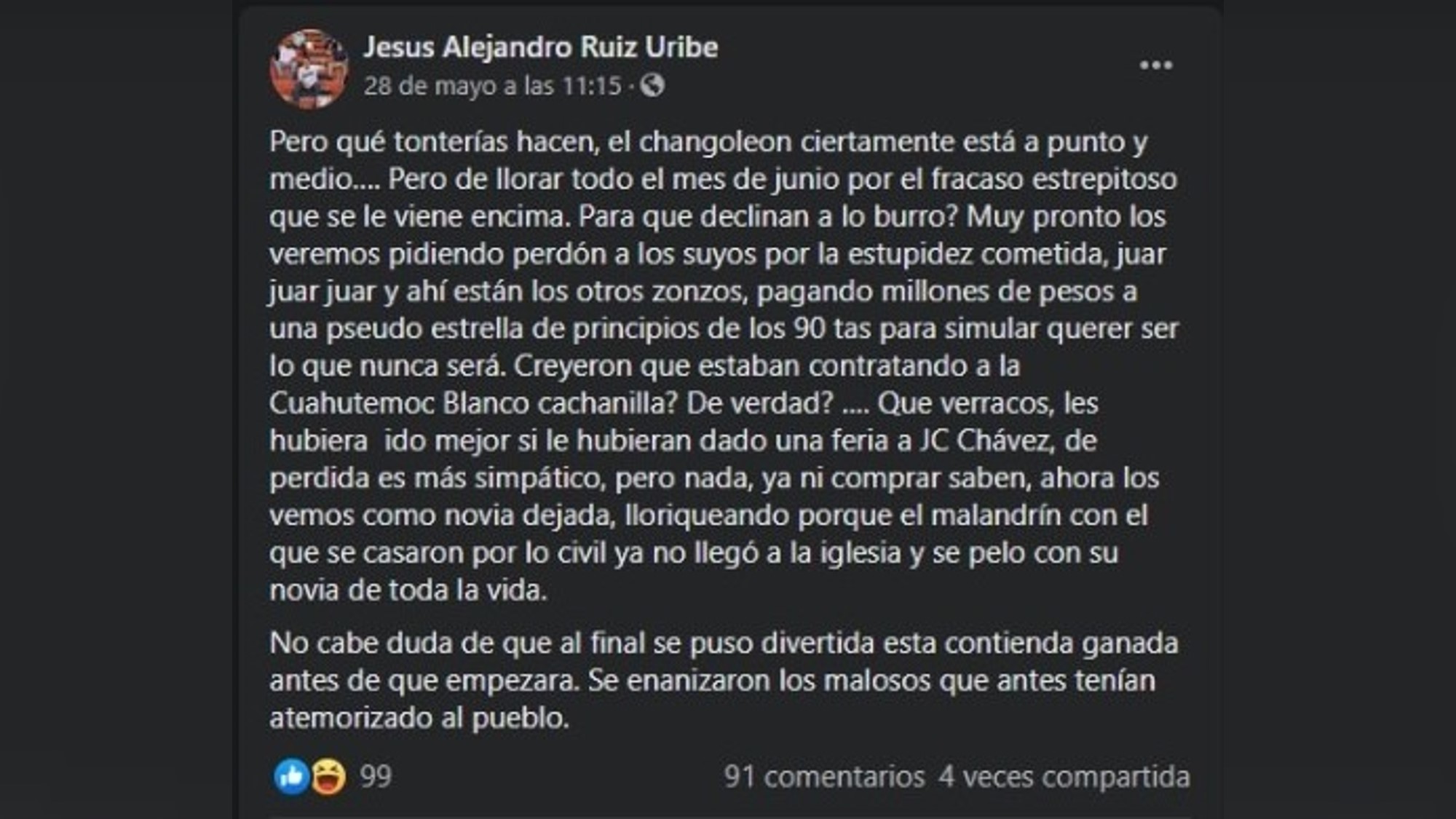 Pero qué tonterías hacen, el changoleon ciertamente está a punto y medio…. Pero de llorar todo el mes de junio por el fracaso estrepitoso que se le viene encima. Para que declinan a lo burro? Muy pronto los veremos pidiendo perdón a los suyos por la estupidez cometida, juar juar juar y ahí están los otros zonzos, pagando millones de pesos a una pseudo estrella de principios de los 90 tas para simular querer ser lo que nunca será. Creyeron que estaban contratando a la Cuahutemoc Blanco cachanilla? De verdad? …. Que verracos, les hubiera ido mejor si le hubieran dado una feria a JC Chávez, de perdida es más simpático, pero nada, ya ni comprar saben, ahora los vemos como novia dejada, lloriqueando porque el malandrín con el que se casaron por lo civil ya no llegó a la iglesia y se pelo con su novia de toda la vida.