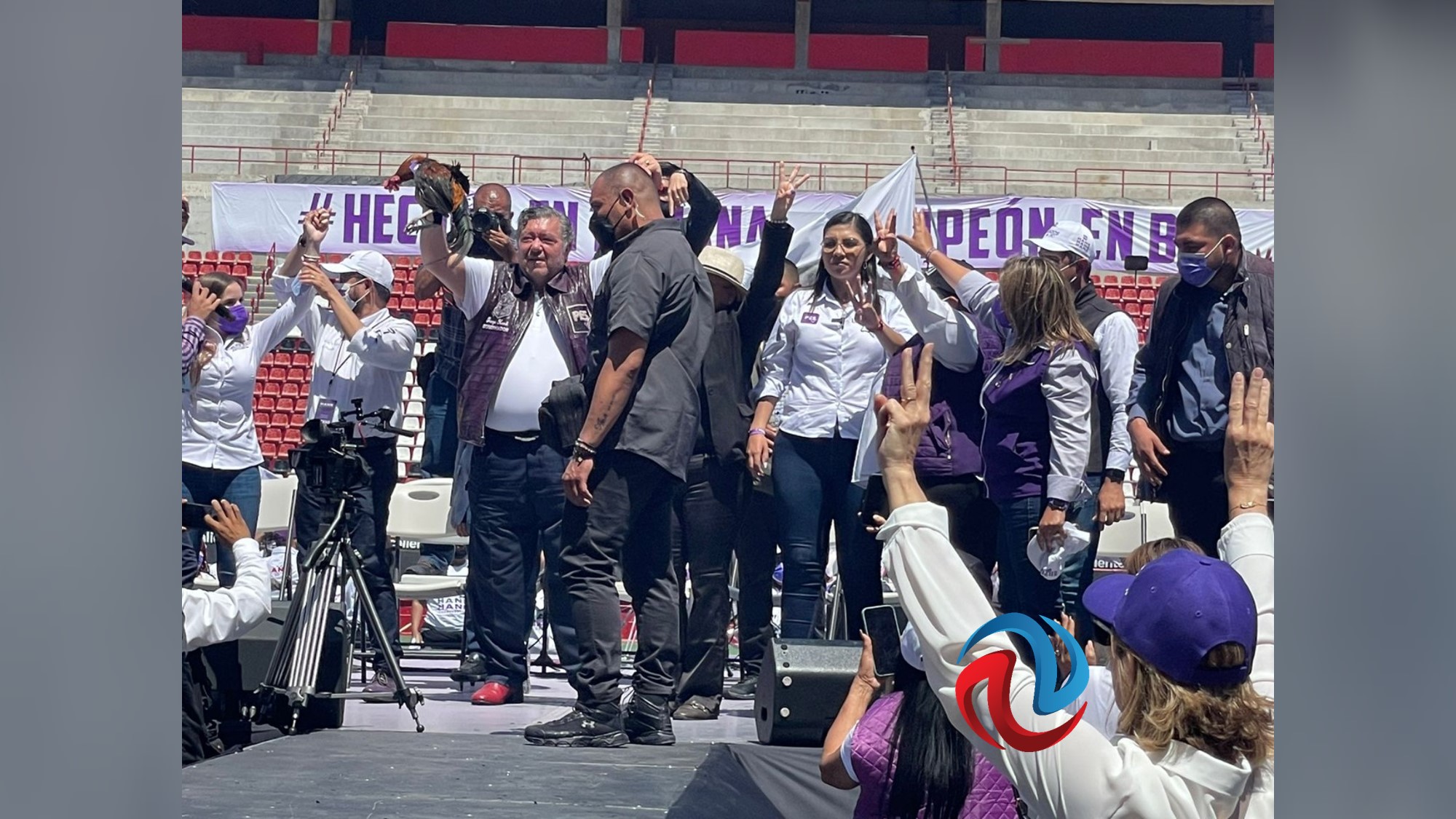 Después del mitin y las palabras que dirigieron los oradores autorizados, y el propio Hank, el candidato al gobierno de la entidad por el Partido Encuentro Solidario (PES) levanto en alto a un flácido gallo, que unos decían en tono de broma, que se había "dormido o desmayado", seguramente por la "espera", y otros, que ya había pasado “a mejor vida”.