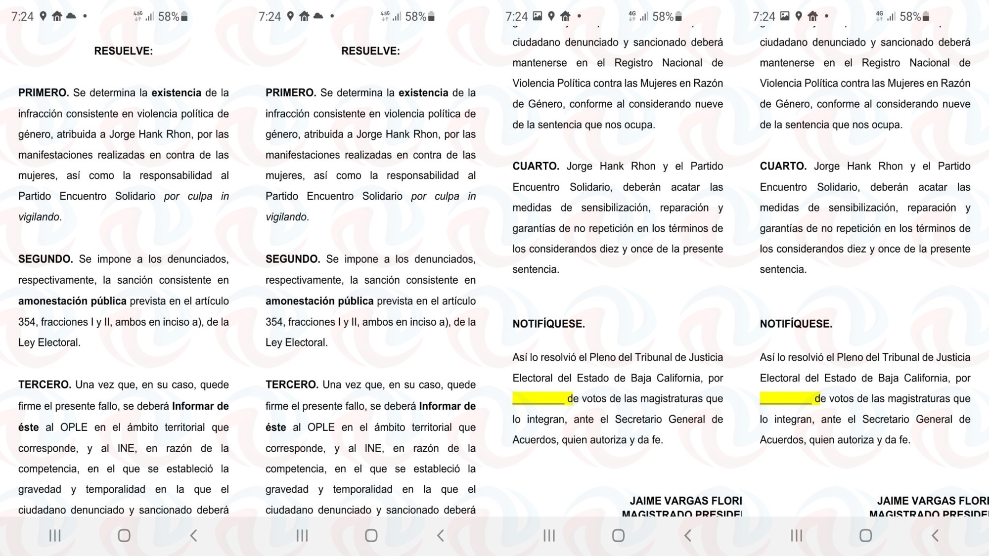 El caso en contra de Jorge Hank Rhon -como ya les comentamos- fue presentado ante el Instituto Estatal Electoral de Baja California, por el grupo de Rebeca Maltos, por aquello de que las mujeres estábamos perdiendo “un poquito” la inteligencia, y a consecuencia de eso, el IEE ordenó que el candidato se disculpara, y consideró al PES corresponsable por el hecho.