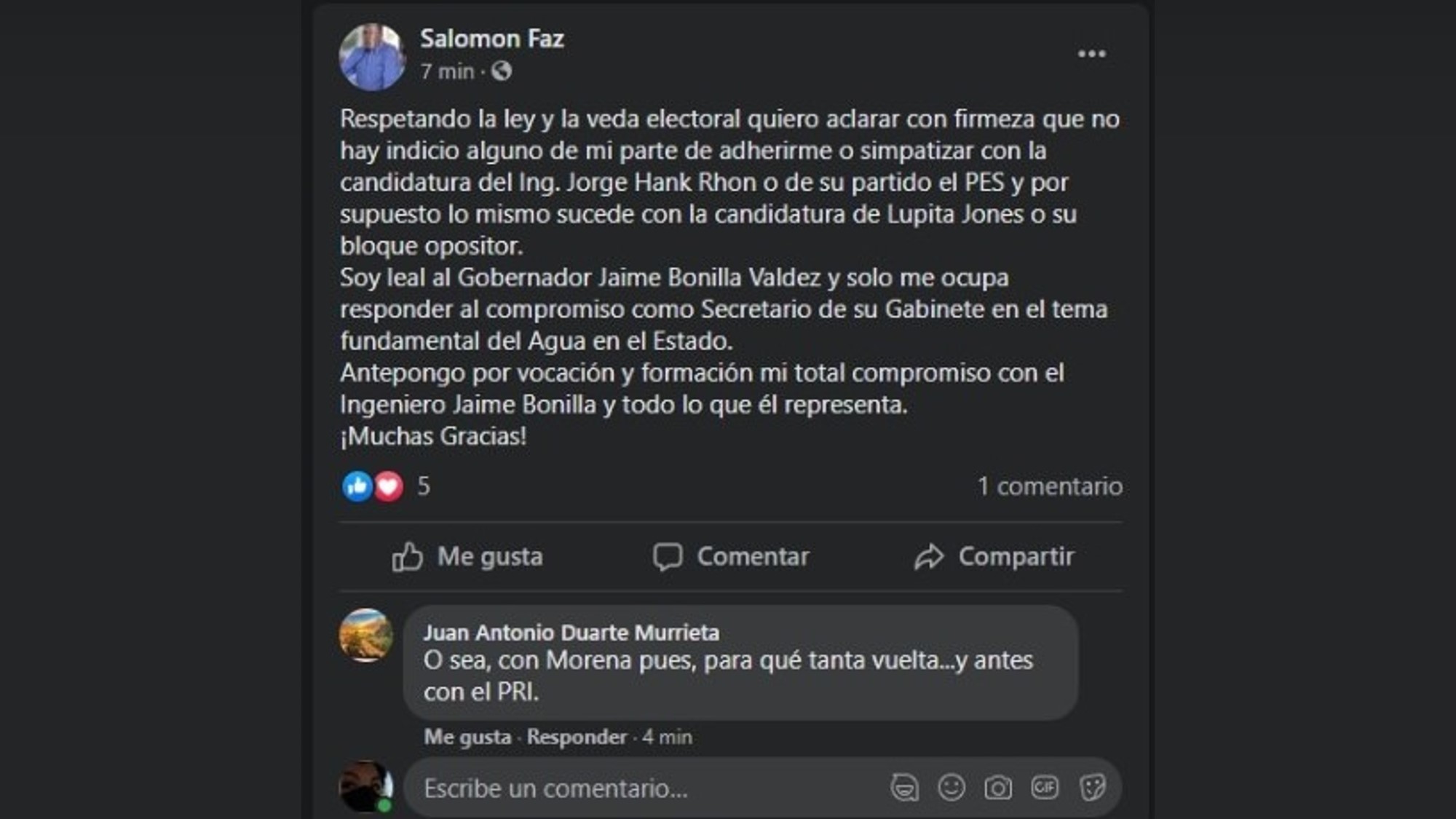 PD9.- Hoy llamó -de nueva cuenta- nuestra atención el secretario del Agua del gobierno Estatal, Salomón Faz ya que publicó un comentario en sus redes que, parece ser una respuesta a otra “campaña negra” que lo hacía dando la espalda a la candidata de Morena, Marina del Pilar Ávila Olmeda, para supuestamente adherirse a otro candidato.