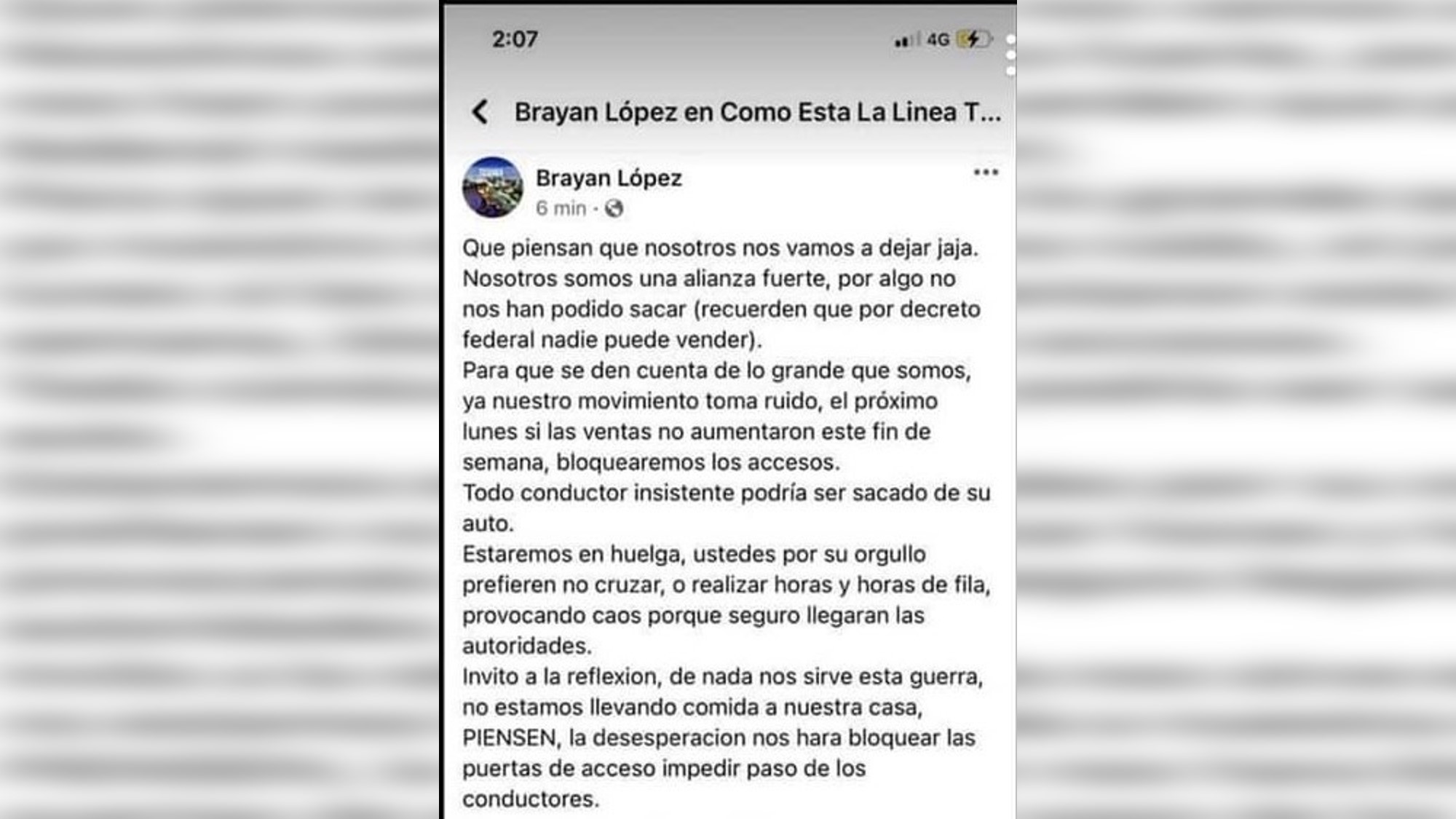 Invito a la reflexión: de nada sirve esta guerra, no estamos llevando comida a nuestra casa; piensen. La desesperación nos hará bloquear las puertas y accesos e impedir de los conductores”.