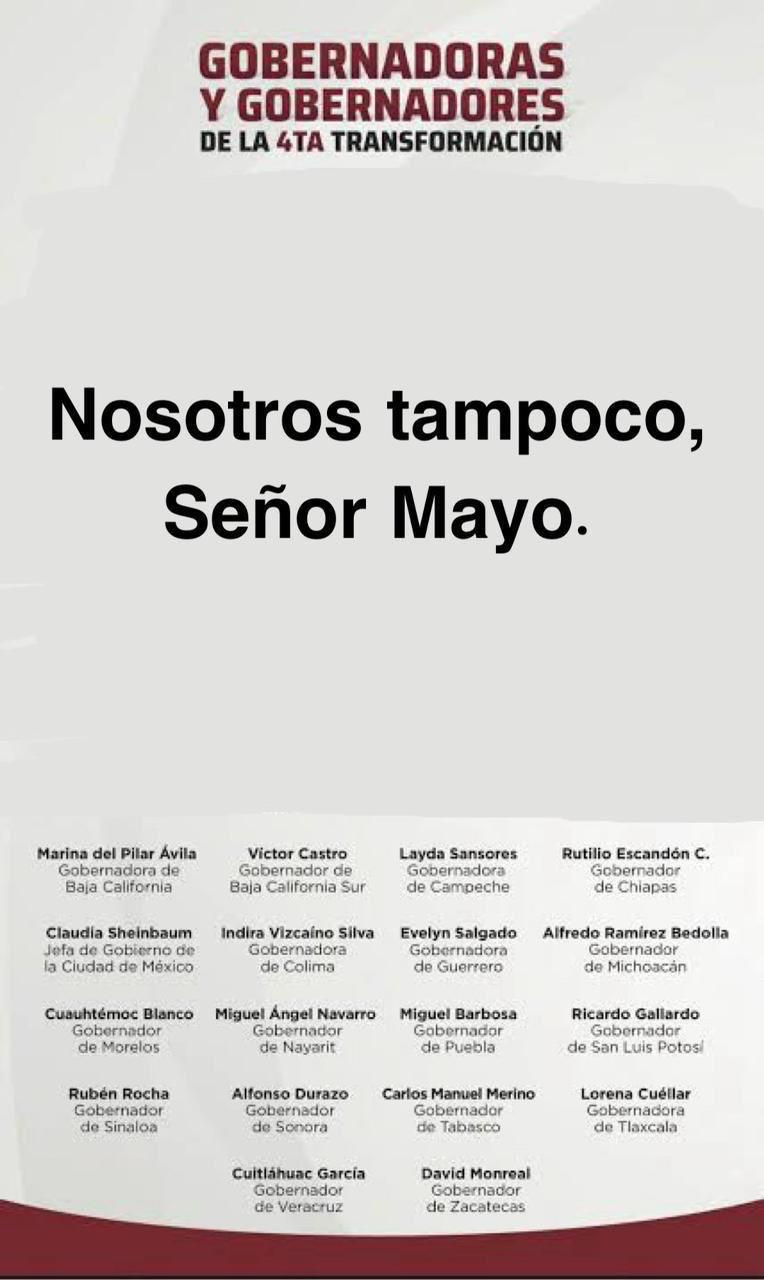 Tan fue así que salió por ahí un mensaje en formato similar al que utiliza el gobierno de México, para supuestamente mandar el mensaje de que ellos no participaron, y también otro, con el clásico formato de la carta de gobernadores morenistas, que en todo asunto han servido de comparsa al presidente.