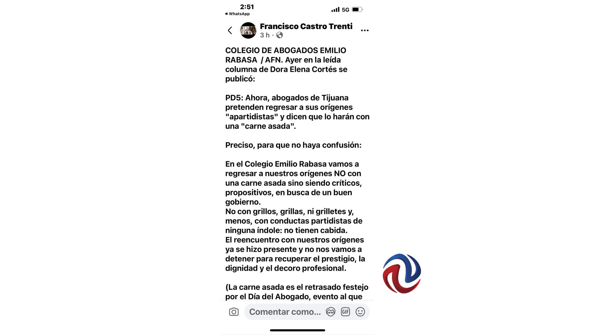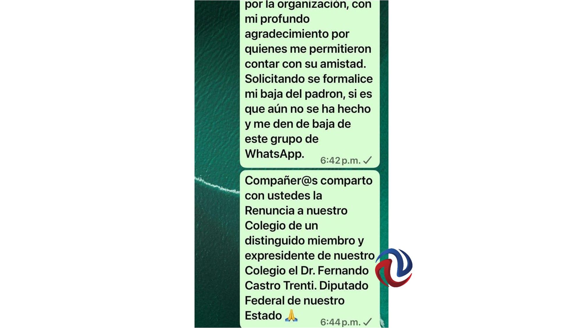 Fernando Castro Trenti, quien ha sido militante de esta agrupación e inclusive su presidente, sin referirse directamente a lo que ocurre dentro de ese organismo, ni lo que se dice sobre su familiar, envió en el chat del Colegio un muy extenso mensaje que, en concreto, después de toda su historia referida, pide que se le dé de baja de dicho Instituto.