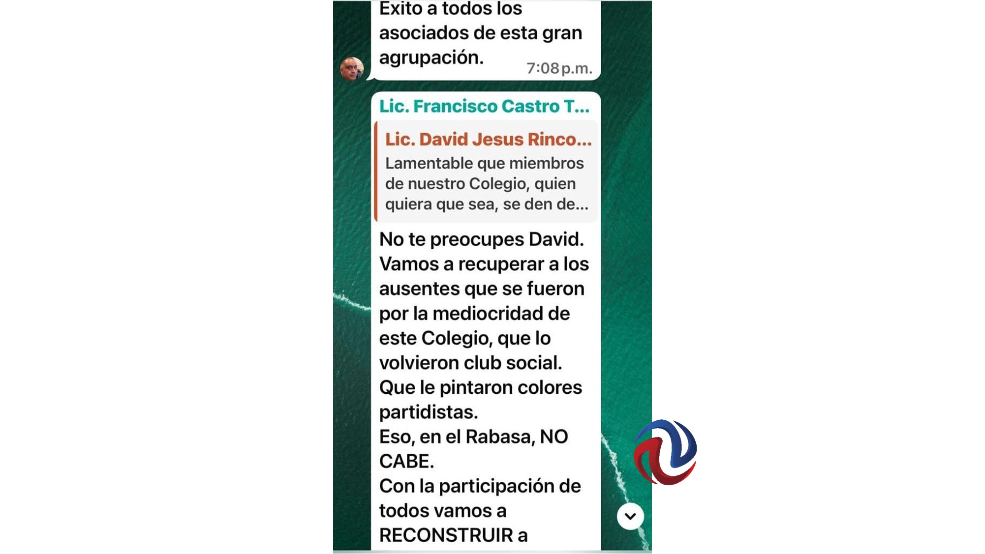 "No te preocupes David. Vamos a recuperar a los ausentes que se fueron por la mediocridad de este Colegio que lo volvieron club social. Que le pintaron colores partidistas. Eso, en el Rabasa no cabe. Con la participación de todos vamos a reconstruir a nuestro Colegio.
