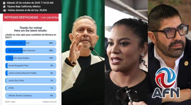 TIJUANA BC 25 DE OCTUBRE DE 2025 (AFN).- Ayer por la noche concluimos nuestra encuesta para conocer la opinión de nuestros lectores en torno a quién consideran el más apto, hablando en forma general de hombres y mujeres, para convertirse en el candidato de Morena a la gubernatura de Baja California en 2027, y señalamos los nombres de aquellos que son mencionados por su interés en suceder a Marina del Pilar Ávila o que son nombrados como los de mayores posibilidades.