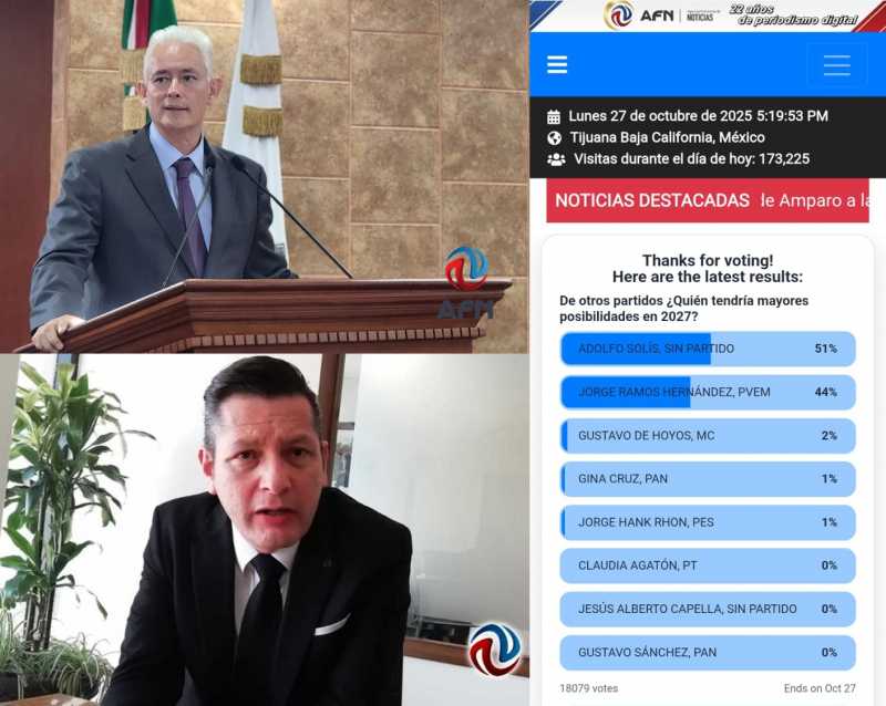 TIJUANA BC 27 DE OCTUBRE DE 2025 (AFN).- Lo que sí ha sido una verdadera revelación en nuestros sondeos que estamos realizando a través de nuestra página Web de Agencia Fronteriza de Noticias (AFN), es el hecho de que un político consumado, fuerte operador político y encima de todo, ex presidente municipal de Tijuana, haya estado batallando, como se ve que lo hace, frente al empresario y profesionista Adolfo Solís Farías.