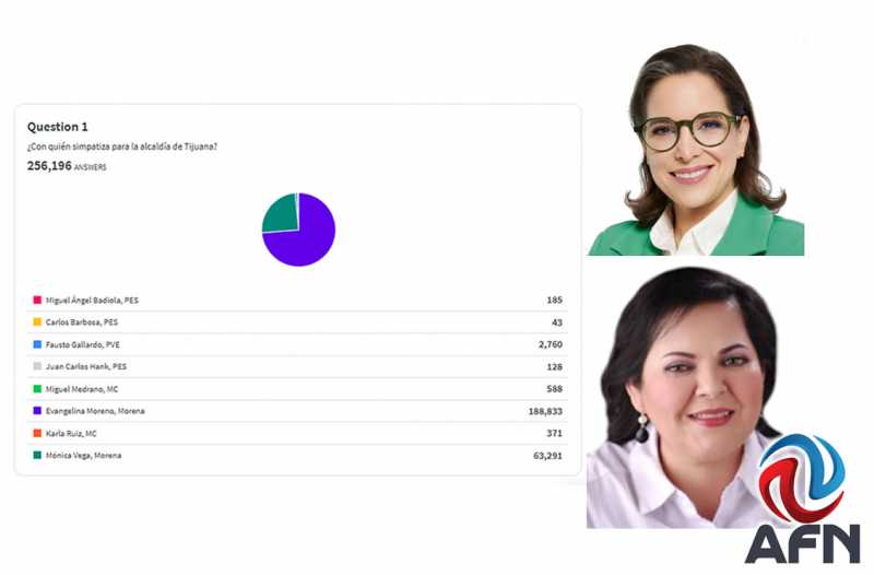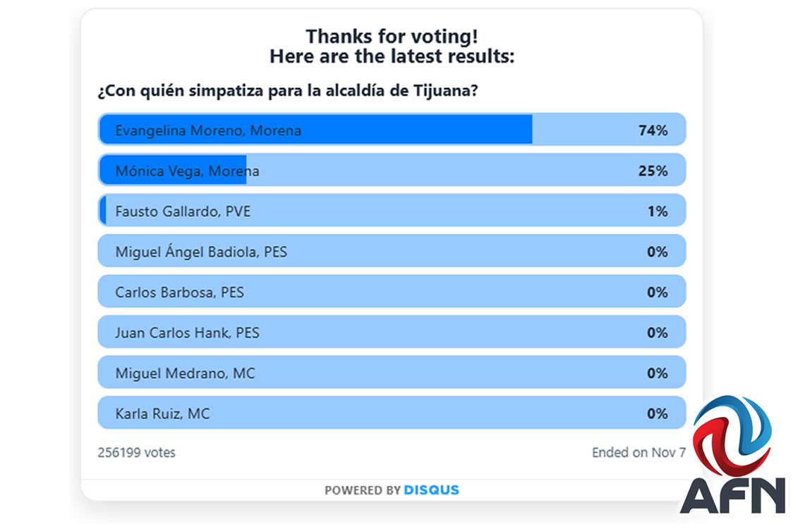 TIJUANA BC 8 DE NOVIEMBRE DE 2025 (AFN).- La encuesta dedicada por Agencia Fronteriza de Noticias (AFN) para otros aspirantes por la alcaldía de Tijuana la pelearon de tal manera que, prácticamente, votaron digitalmente en un número que se aproximaba a los votos que le dieron el triunfo en la elección constitucional al actual munícipe, Ismael Burgueño Ruiz.