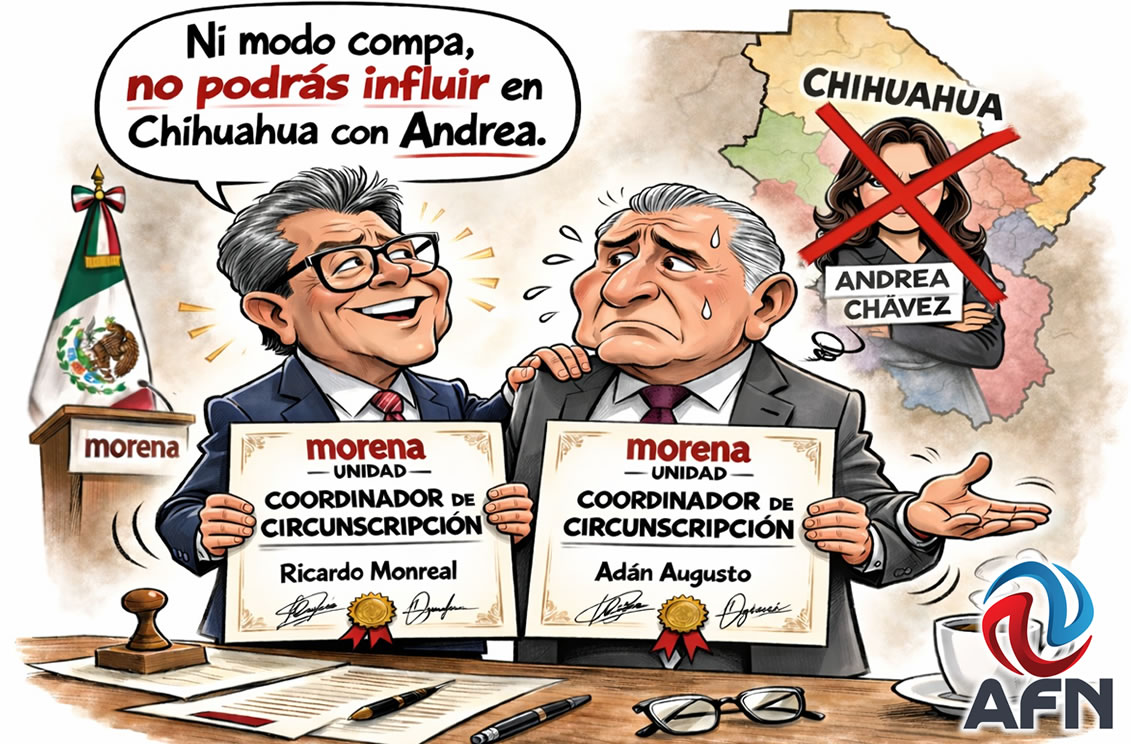 Como era obvio, queda prácticamente en la zona central del país, aunque no tendrá influencia en su querido Tabasco, ni en los circunvecinos, en los que ha tenido influencia y mucho menos en el Norte, en Chihuahua, lo que haría muy difícil que pudiese imponer a su protegida Andrea Chávez, no obstante haber asegurado (a manera de reto para la presidenta), que su compañera en el Senado sería no solo la candidata, sino la próxima gobernadora "porque Chihuahua se lo merece", dijo.