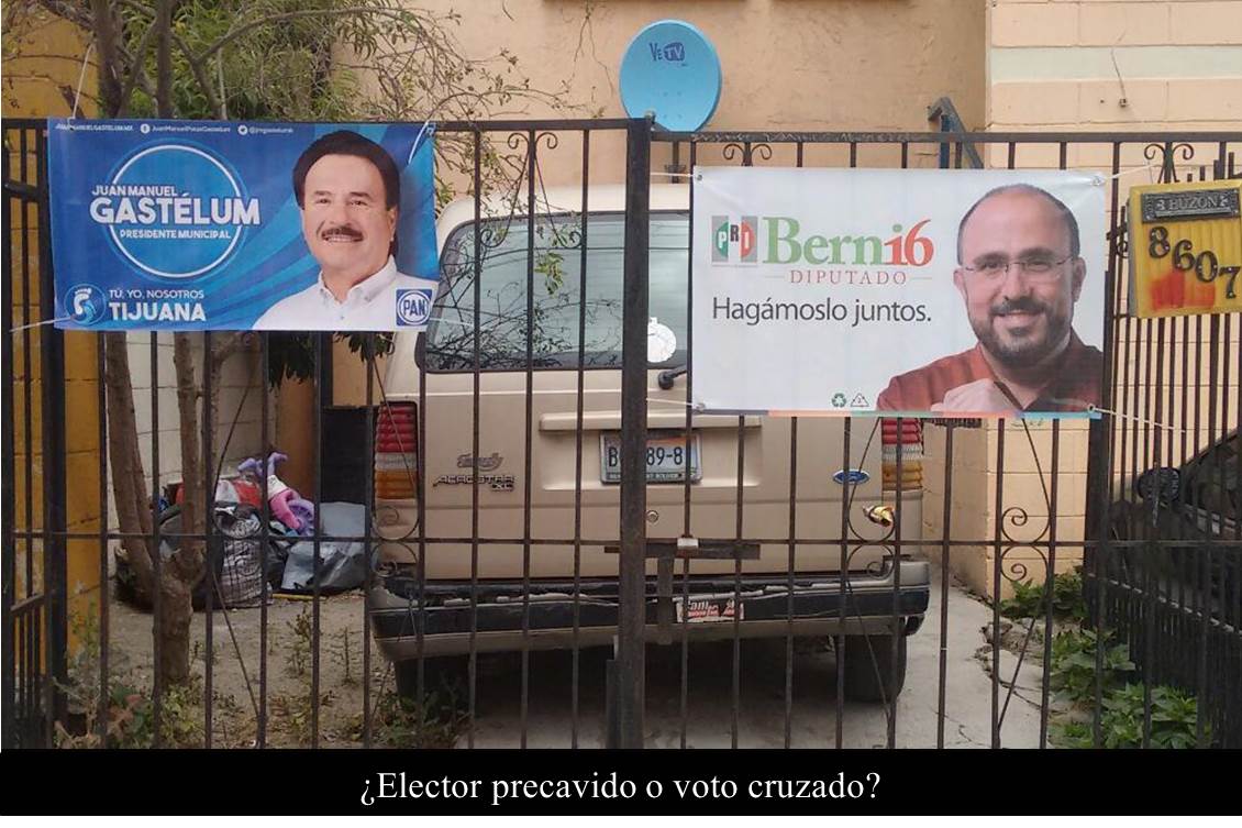 PD1.- ¿Elector precavido o voto cruzado? En este domicilio del distrito XVI sus moradores prefieren no errarle y le “apuestan” a los dos partidos. En este caso, apoyan al candidato panista Juan Manuel Gastélum Buenrostro para la alcaldía y a Bernardo –Bernie- Padilla Muñoz, del PRI para la diputación.