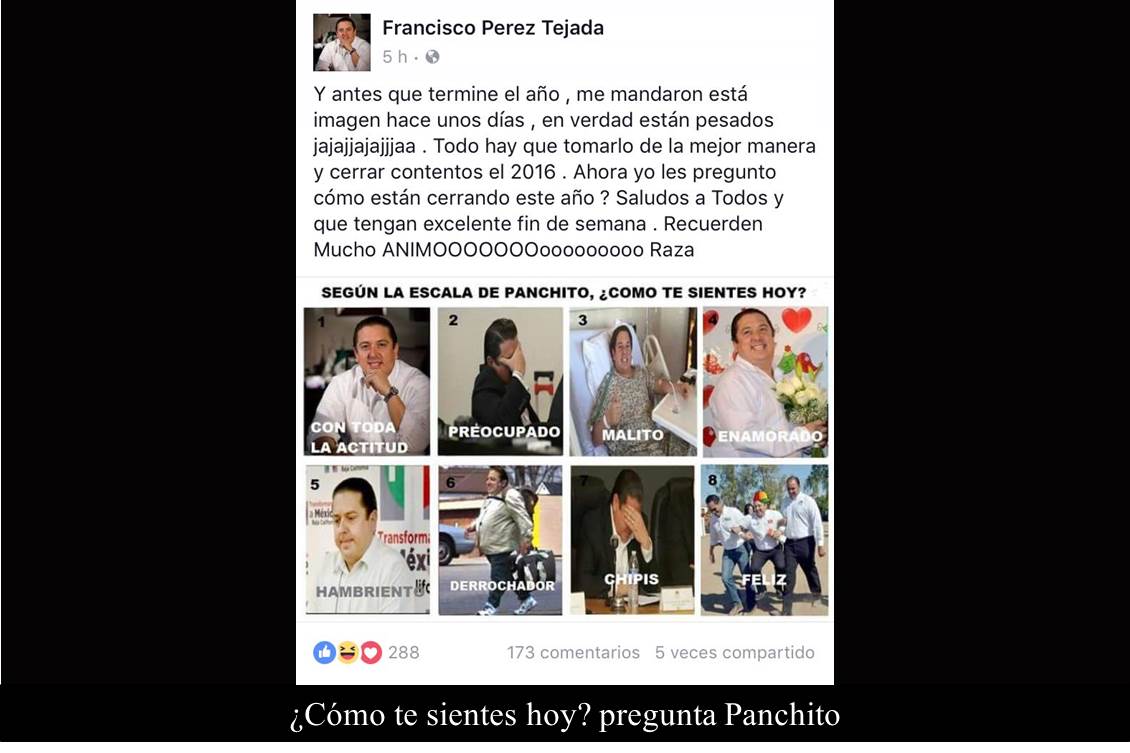 PD5.- Quien sí está contento y “ni suda ni se acongoja”, es el exalcalde de Mexicali Francisco Pérez Tejada Padilla, quien a la espera del fin de este 2016, compartió una imagen que dice que le hicieron llegar y que al parecer le divierte aunque afirma que están “pesados”. De hecho pregunta a sus amigos: “según la escala de Panchito ¿cómo te sientes hoy?”