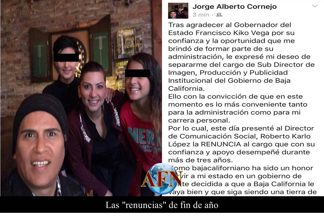 TIJUANA BC 30 DE DICIEMBRE DE 2016 (AFN).- Ahora sí que el fin de año nos llegó con algunas sorpresas por los movimientos que se dieron en estas últimas horas, tanto en el gobierno estatal, como en el municipal. De hecho, la “renuncia” de Jorge Alberto Cornejo Manzo, a la subdirección de Imagen, Producción y Publicidad del gobierno del Estado, no nos significó ninguna sorpresa, porque ya la esperábamos, sin embargo pensamos que ésta se haría pública para los primeros días del año venidero.