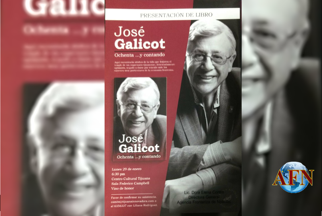 PD5.- Don José Galicot presentará el próximo lunes 29 en el Centro Cultural Tijuana un libro en el que seguramente hablará acerca de sus experiencias de vida como empresario y convencido tijuanense. El libro lleva el título de “Ochenta… y contando”, lo cual seguramente tiene que ver con el número de años que ya acumula con todo orgullo, dice.