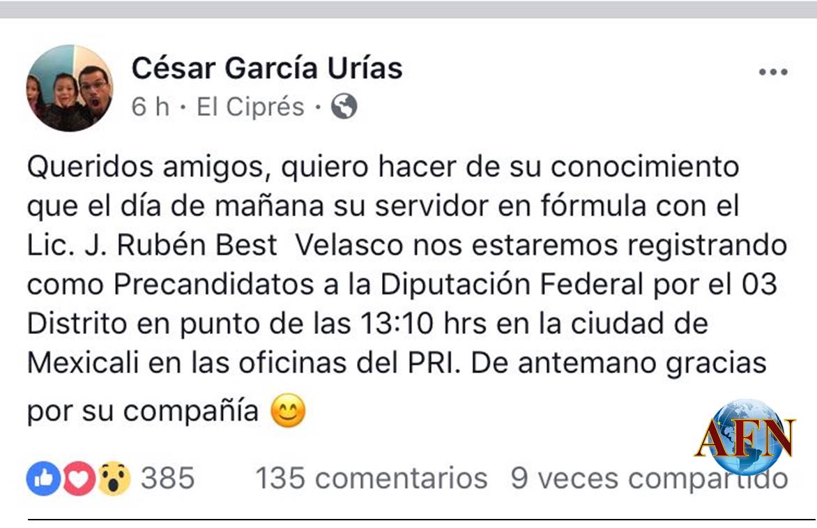 PD4.- Otro priísta que ya mostró agallas, es César García Urías quien también está invitando a sus amigos para que lo acompañen en el registro que hará como precandidato a la diputación Federal por el distrito 03, en fórmula con J. Rubén Best.