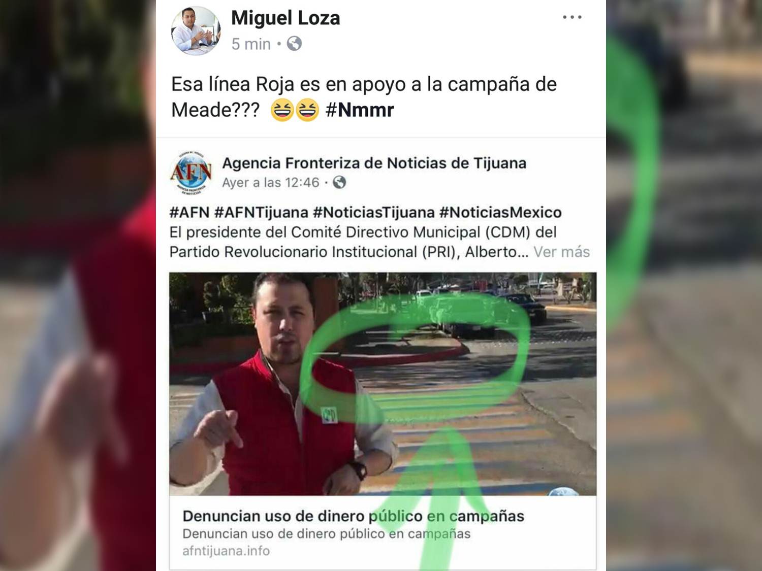PD5.- Recordarán que en días recientes el presidente del Comité municipal del PRI en Tijuana Alberto Nava López denunció uso indebido de recursos por parte del gobierno de la ciudad para “pintar las calles con los colores de la alianza panista”, pero ante ese señalamiento, el albiazul Miguel Loza preguntó que si el color rojo, (internacionalmente conocido como una señal para “no estacionarse”) era por el partido tricolor.