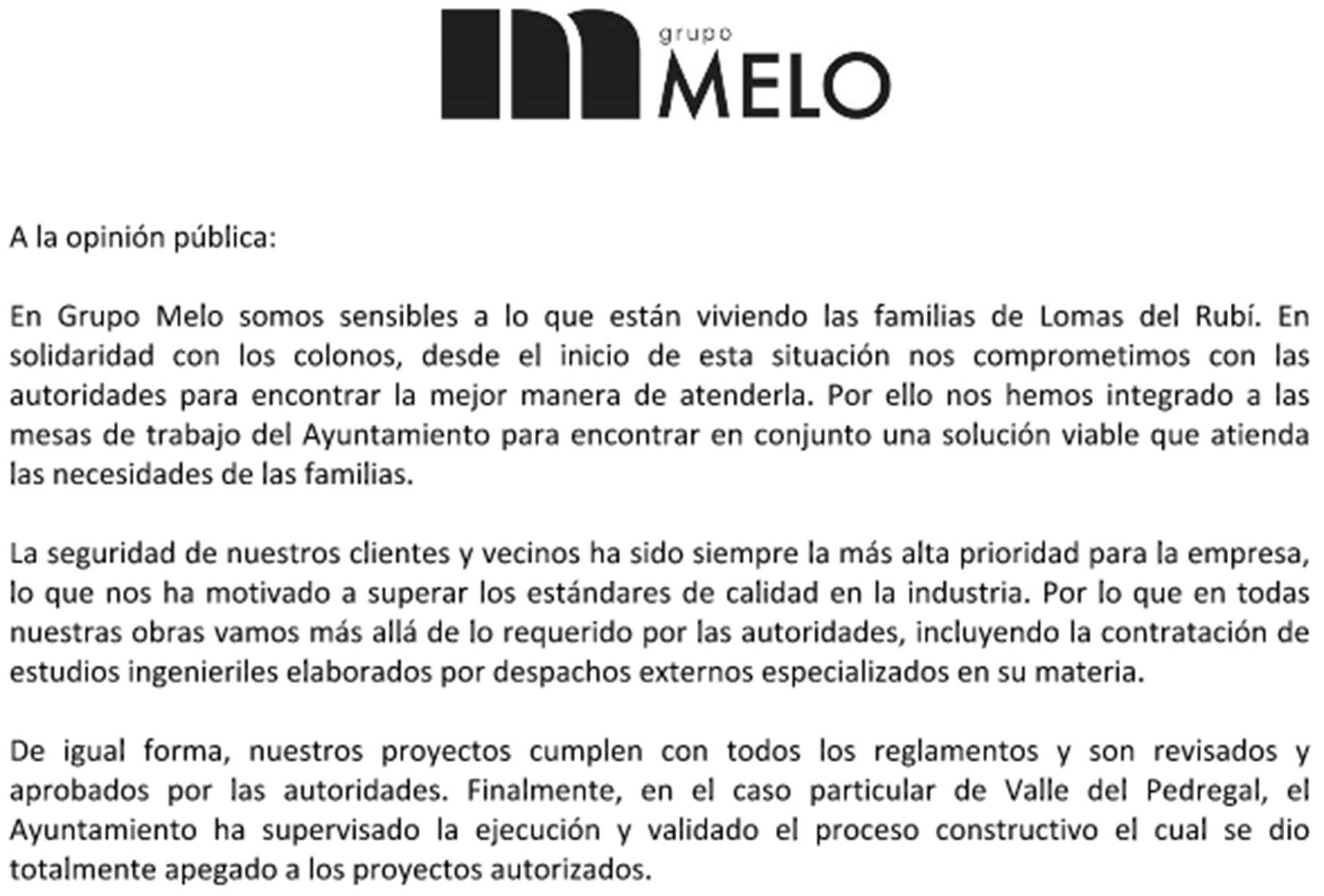 Por eso, piden esperar -como ellos lo han hecho- advirtiendo que “hacer acusaciones sin evidencias fundamentadas es incurrir en una grave irresponsabilidad”. No obstante eso manifiestan que han comunicado a los vecinos afectados, su interés por mantener un diálogo directo y respetuoso con ellos, y en conjunto con el ayuntamiento para llegar a una solución. Para esto, afirmaron también que desde el principio han participado en las mesas técnicas de trabajo del ayuntamiento, en donde se designaron especialistas externos para realizar estudios geológicos y geofísicos, con el propósito de determinar la causa raíz.