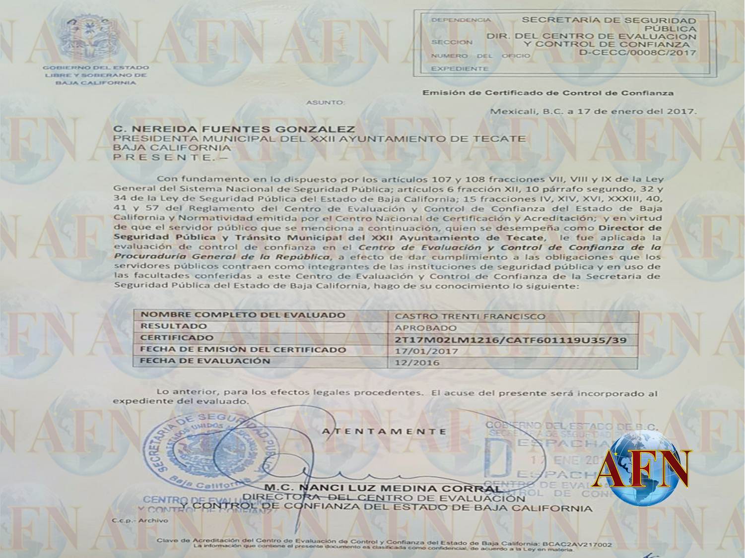 PD3.- En días recientes comentábamos que según algunas fuentes, el secretario de Seguridad Pública en Tijuana Marco Antonio Sotomayor Amezcua era “el único que pasaba los exámenes de control y confianza”. Sin embargo desde Tecate nos llegó el documento que acredita que Francisco Castro Trenti, el director de policía en esa ciudad, también los aprobó.