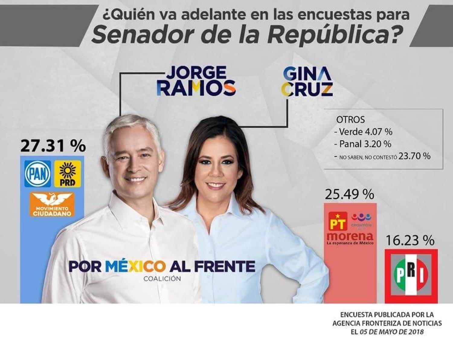 Pero según vi -porque me lo mostró mi reportero del barrio- quienes manejan la campaña de los candidatos al Senado de la República por la alianza “Por México al Frente” están circulando un promocional donde se establece que Jorge Ramos Hernández y Gina Cruz van adelante en las encuestas para la Cámara Alta del Congreso de la Unión, en el que además de reproducir los porcentajes que efectivamente obtienen en esa encuesta, agregan una leyenda donde hace notar que ésta fue publicada “por la Agencia Fronteriza de Noticias el 5 de mayo de 2018”.