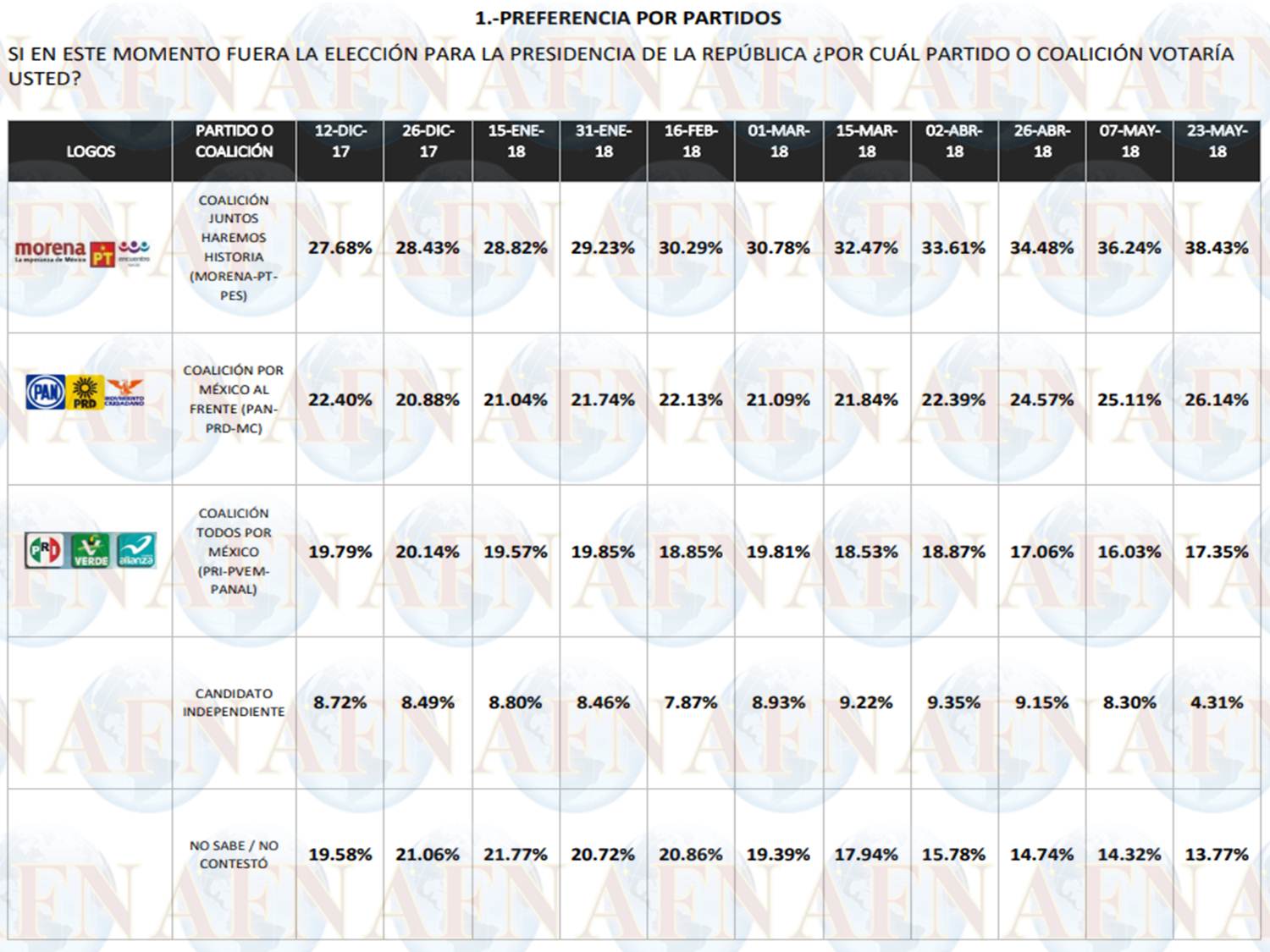 Establecido lo anterior, se indica que en la preferencia por partidos “si en este momento fuera la elección para la presidencia de la República”, un 38.43 por ciento votaría por la Coalición Juntos Haremos Historia de Andrés Manuel López Obrador, contra el 27.68 por ciento que obtuvo en la primera medición del 12 de diciembre de 2017.
