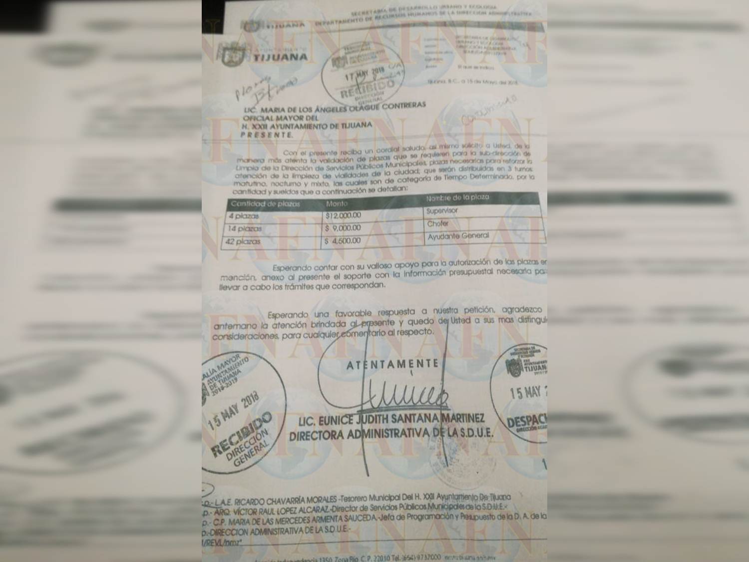 Se están pidiendo 4 plazas de supervisor de $12,000 pesos; 14 plazas para chofer de $9,000 pesos y 42 plazas para ayudante general de $4,500 pesos según un documento firmado por Eunice Judith Santana Martínez directora administrativa de la SEDUE.
