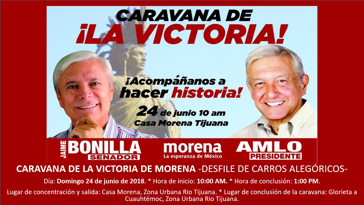 PD6.- Por cierto, Morena ya está anunciando como cierre de campaña en Tijuana su Caravana de la Victoria, para el próximo 24 de este mes, en la que pretenden contar con una gran cantidad de simpatizantes.