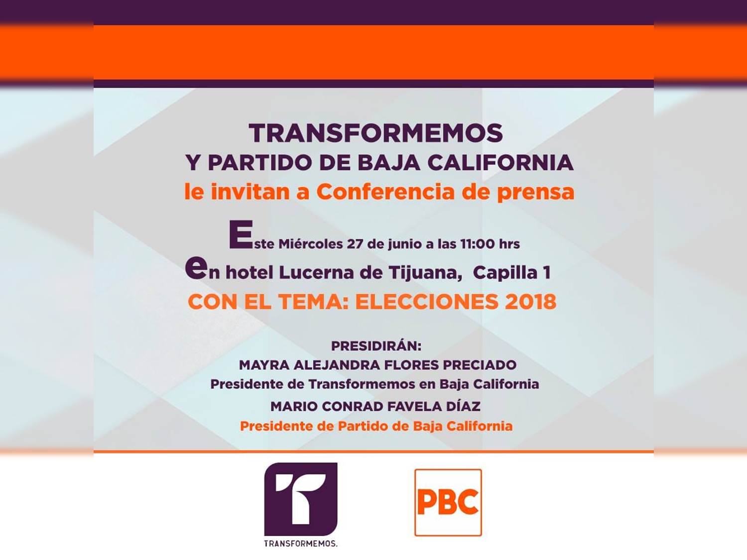 PD1.- El recién nacido partido Transformemos, y el partido de Baja California (PBC) están llamando para mañana a conferencia de prensa conjunta que tendrá lugar en Tijuana, según parece, para invitar a que la población salga a votar el próximo 1 de julio.