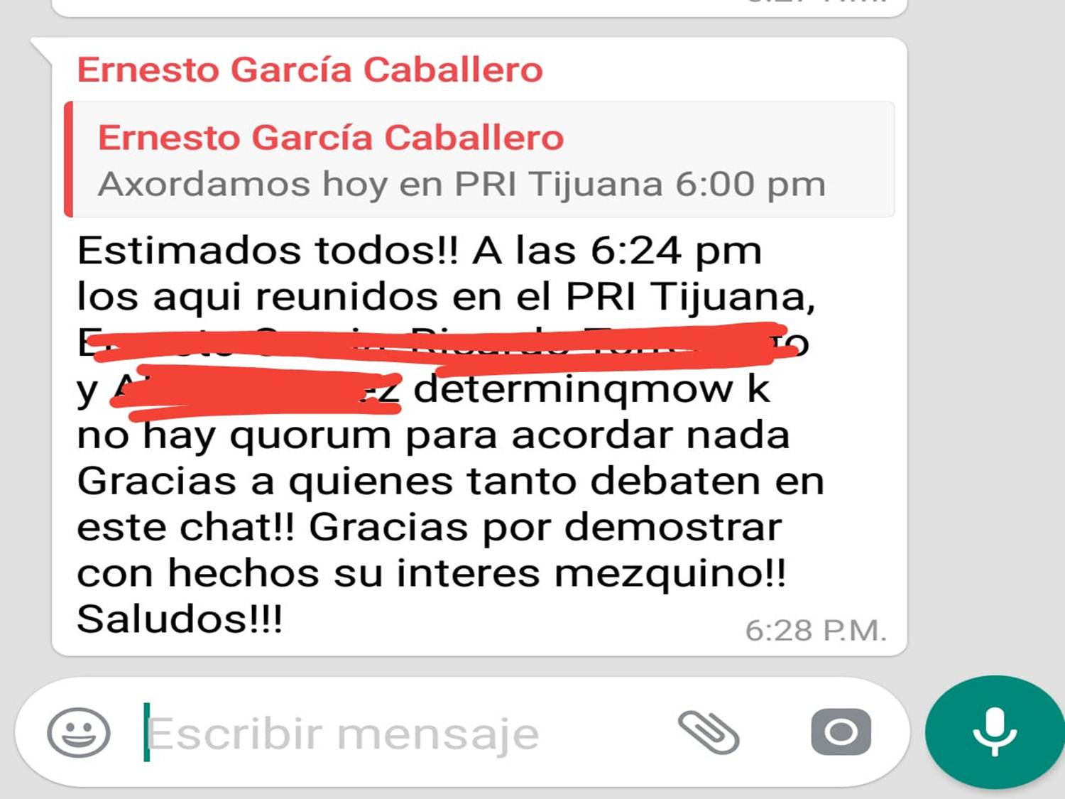 PD8.- Molesto, uno de los convocantes publicó más tarde: “Estimados todos!! A las 6:24 PM los aquí reunidos en el PRI Tijuana (y aparecen borrados los nombres) determinamos que no hay quórum para acordar nada. Gracias a quienes tanto debaten en este chat!! Gracias por demostrar con su hechos interés mezquino!! Saludos!!