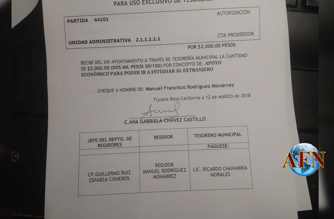 Rodríguez Monárrez mostró a su vez, el recibo oficial de control de gastos de orden social, que corresponde a un “comprobante de caja” que es de uso exclusivo de la Tesorería. Dicho documento incluido en la partida 44101 muestra que el día 12 de marzo, el regidor le entregó a la joven, tan sólo $2,000 pesos, que asegura que es el máximo que puede dar como apoyo, y el cual nunca rebasa. Esos $2,000 pesos, afirmó, eran para que la joven completara la cantidad que necesitaba para su viaje.
