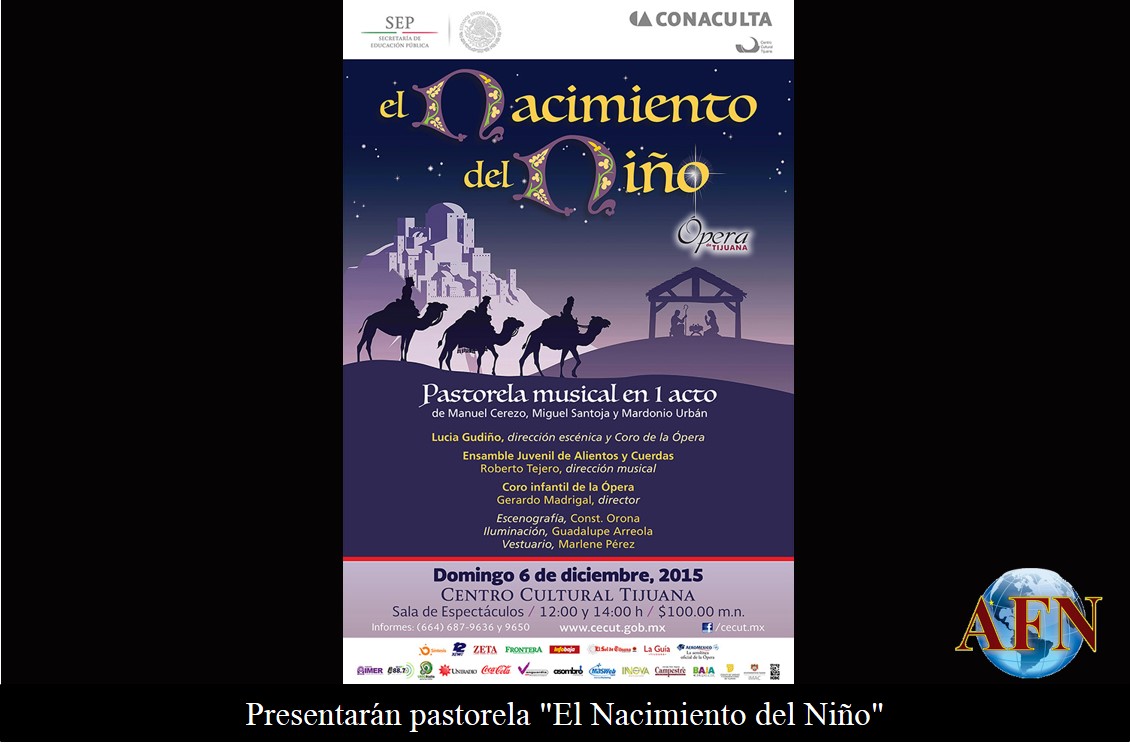 TIJUANA BC 3 DE DICIEMBRE DE 2015.- La Sala de Espectáculos del Centro Cultural Tijuana presentará este domingo 6 de diciembre la pastorela musical en I acto El Nacimiento del Niño como parte de su Festival Navideño 2015 y en el marco del 15 aniversario de la Ópera de Tijuana, con dos funciones a las 12:00 y 14:00 horas.
