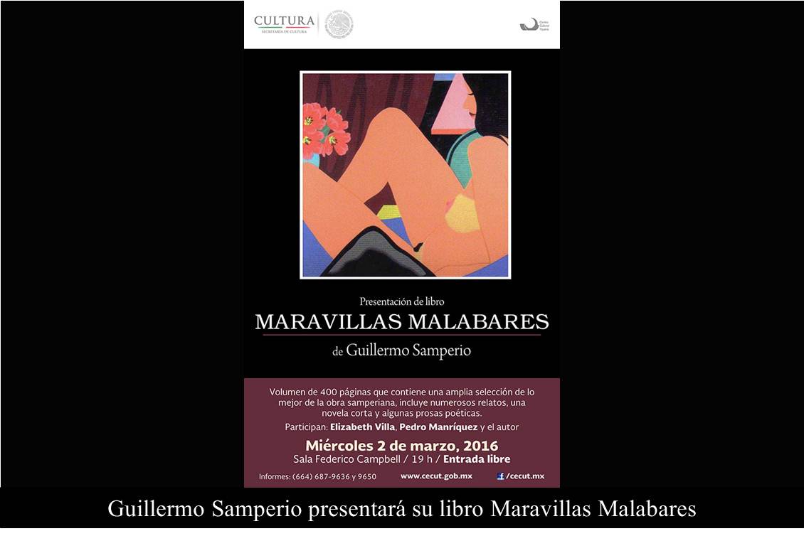 TIJUANA BC 28 DE FEBRERO DE 2016.- El prolífico escritor Guillermo Samperio presentará en la Sala Federico Campbell del Centro Cultural Tijuana el libro Maravillas malabares, el miércoles 2 de marzo a las 19:00 horas.