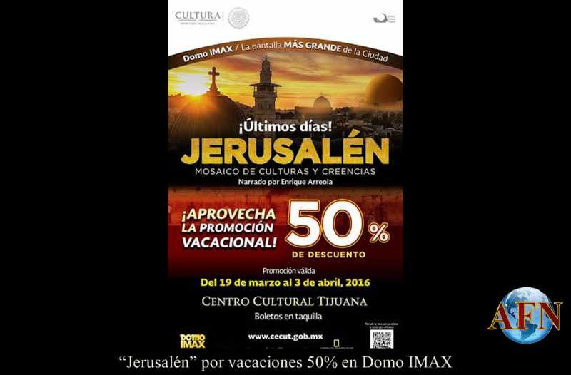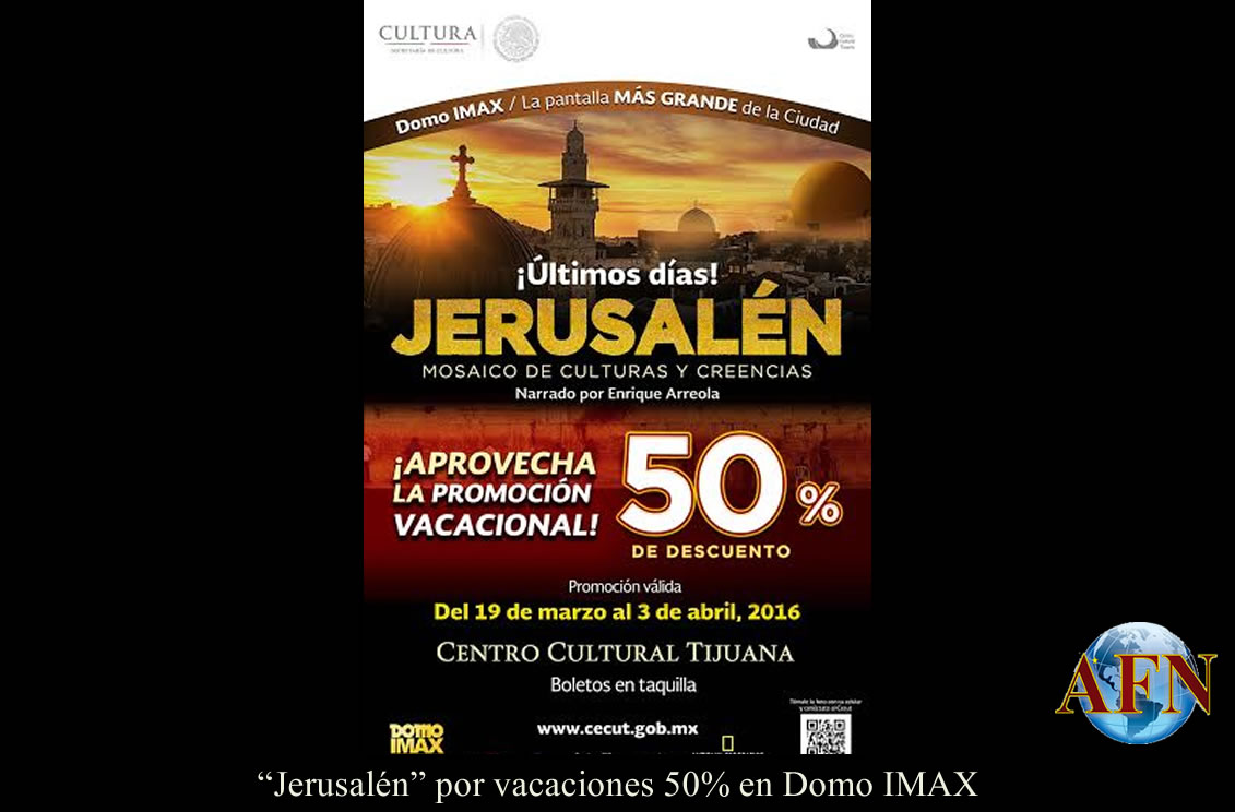 TIJUANA BC 23 DE MARZO DE 2016 (AFN).- Hoy 23 de marzo hasta el día tres de abril, los tijuanenses podrán visitar el Domo IMAX que exhibe la cinta “JERUSALÉN”, filmada en uno de los sitios más célebres del planeta; Jerusalén, mosaico de culturas y creencias destaca por su carácter histórico, pero también, por la estética visual que ofrece al espectador.