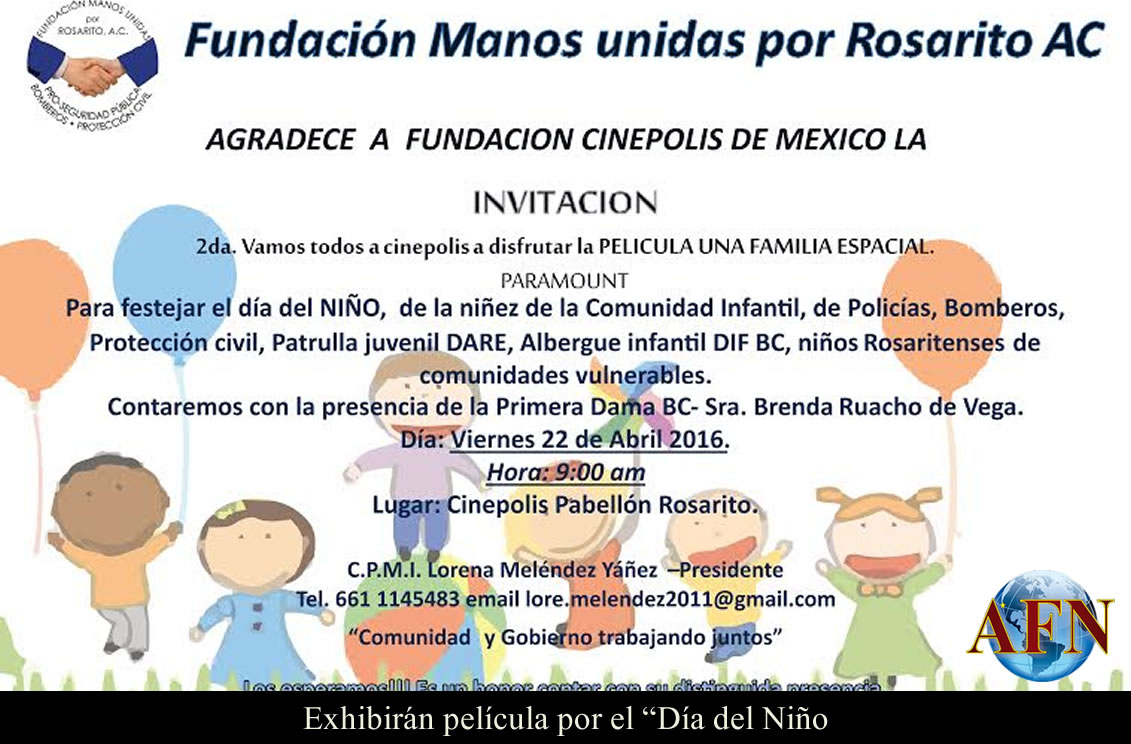 ROSARITO BC 21 DE ABRIL DE 2016 (AFN).- Fundación Manos Unidas por Rosarito, AC preparó para festejar a los pequeños con motivo del “Día del Niño” que se celebra el 30 de abril, una película para toda la familia de Paramount titulada “Una familia especial”, informaron en comunicado de prensa.