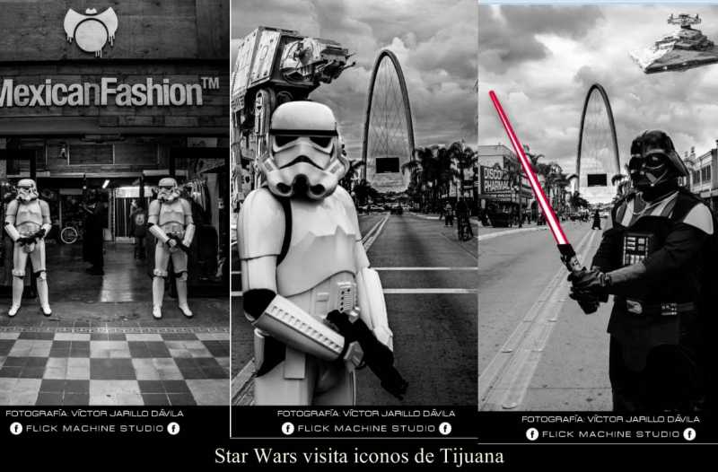 Las imágenes muestran una interacción de esta ciudad fronteriza entre personajes como Darth Vader y los burros-cebra, Death Star y Darth Vader en el Centro Cultural Tijuana, la princesa Leía en la preparación de tacos o algunos otros personajes manejando calafias.