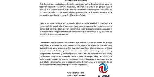 TIJUANA BC 4 DE NOVIEMBRE DE 2025 (AFN).- Grupo Cosmopolitan rechazó haber intervenido o participado en el evento celebrado en una ...