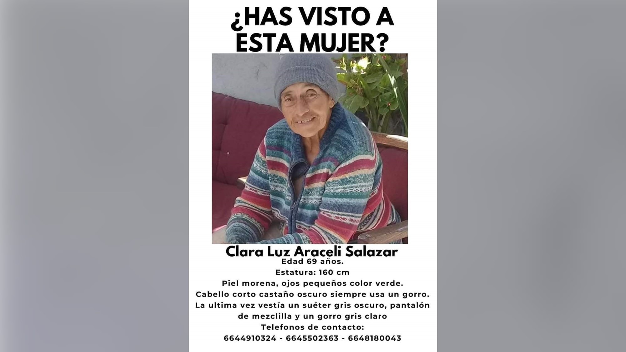 Araceli tiene una estatura de 1.60, piel morena, ojos color verde, cabello corto castaño oscuro y la última vez portaba un suéter gris oscuro, pantalón de mezclilla y un gorro, si tiene aguna información referente a este caso, se puede comunicar al número 664-491-0324 y al 664-550-2363.