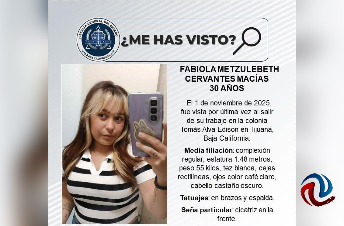 TIJUANA BC 14 DE NOVIEMBRE DE 2025 (AFN).- Compañeros del Sindicato Unidos con México Moderno (SUCOMM) y familiares de Fabiola Metzulebeth Cervantes Macías, de 30 años de edad, están pidiendo ayuda para localizarla, ya que fue vista por última vez al salir de su trabajo en la colonia Tomás Alva Edison, en Tijuana, el pasado 1 de noviembre.