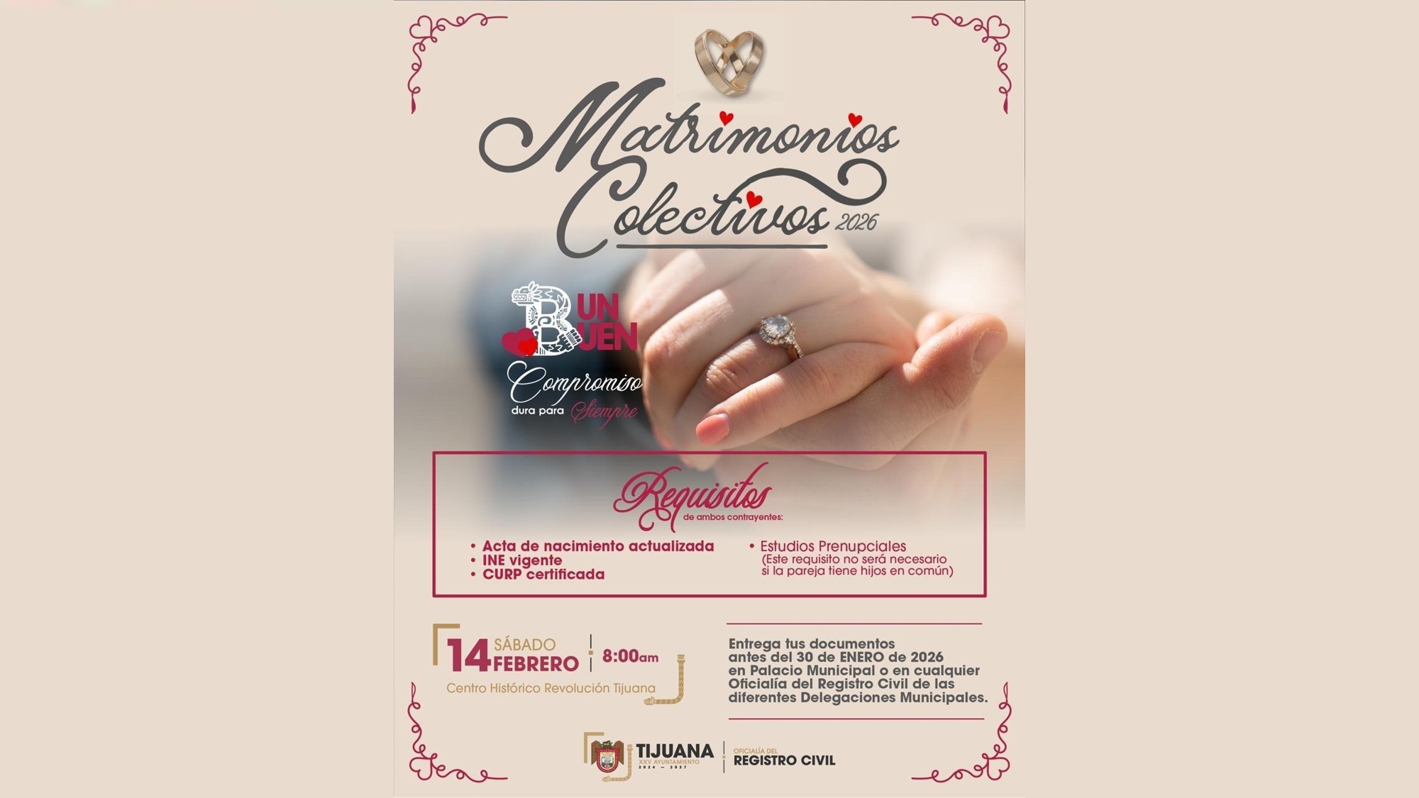 TIJUANA BC 15 DE ENERO DE 2026 (AFN).- Sigue vigente la campaña para participar en “Matrimonios Colectivos 2026”, a realizarse el sábado 14 de febrero en la avenida Revolución, del Centro Histórico de Tijuana, informó Odalys Valenzuela Espinoza, oficial 01 del Registro Civil.