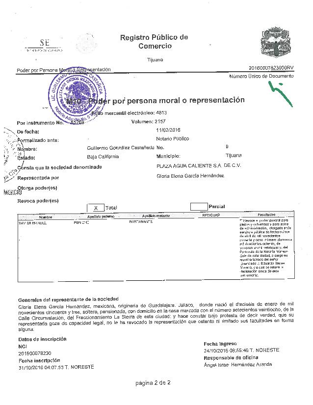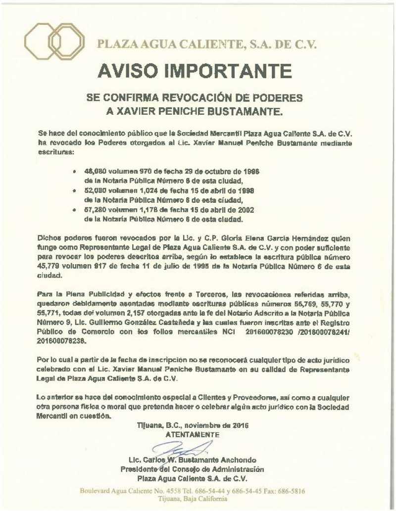 El presidente del Consejo de Administración de Plaza Agua Caliente SA de CV Carlos W. Bustamante Anchondo, anunció que a Xavier Peniche Bustamante le fueron revocados los poderes otorgados a través de tres notarías, y esta revocación la hizo la licenciada y C.P. Gloria Elena García Hernández quien funge como representante legal de “Plaza Agua Caliente SA de CV”