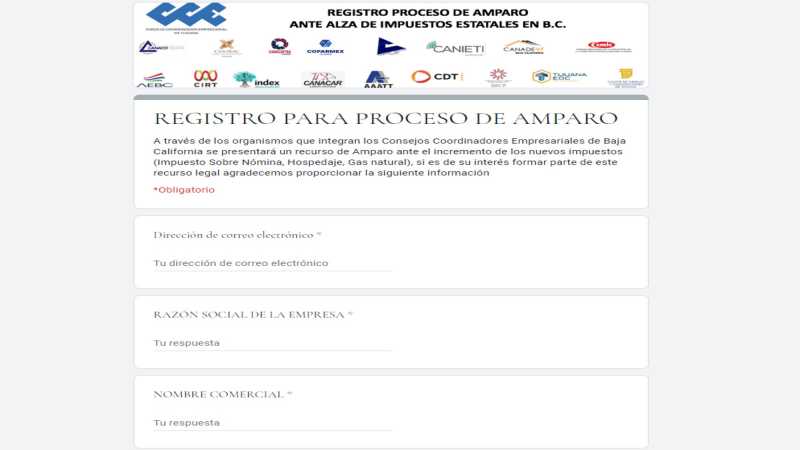 TIJUANA BC 20 ENERO DE 2020 (AFN).- Empresarios revelaron el formato que utilizarán para el registro de aquellos que deseen ampararse ante el alza del Impuesto Sobre Nómina, Impuesto sobre la venta de gas natural y sus derivados del petróleo, y del impuesto en servicio de hospedaje en hoteles, moteles y a través de medios digitales, informó el Consejo Coordinador Empresarial, que hizo un llamado a los afectados en cada uno de esos sectores, a registrarse si desean buscara la protección de la justicia federal.