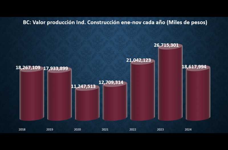 TIJUANA BC 27 DE ENERO DE 2025 (AFN).- El valor de la producción de la Industria de la Construcción de Baja California se hundió 30.3% a tasa anual durante el acumulado enero a noviembre de 2024 respecto al mismo lapso de 2023, de acuerdo con los datos del Instituto Nacional de Estadística y Geografía (INEGI).