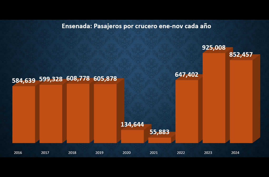 TIJUANA BC 28 DE ENERO DE 2025 (AFN).- Los pasajeros por cruceros hacia Ensenada documentaron una contracción del 7.8% a tasa anual entre enero y noviembre de 2024 en comparación al mismo lapso, pero del año inmediato anterior, de acuerdo con las cifras de Datatur de la Secretaría de Turismo federal.