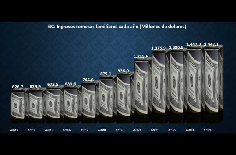 El monto de remesas familiares al Estado llegó a los Mil 447.1 millones de dólares en el año que recién concluyó, prácticamente igual a los Mil 447.3 millones de dólares que el banco central documentó en 2023.