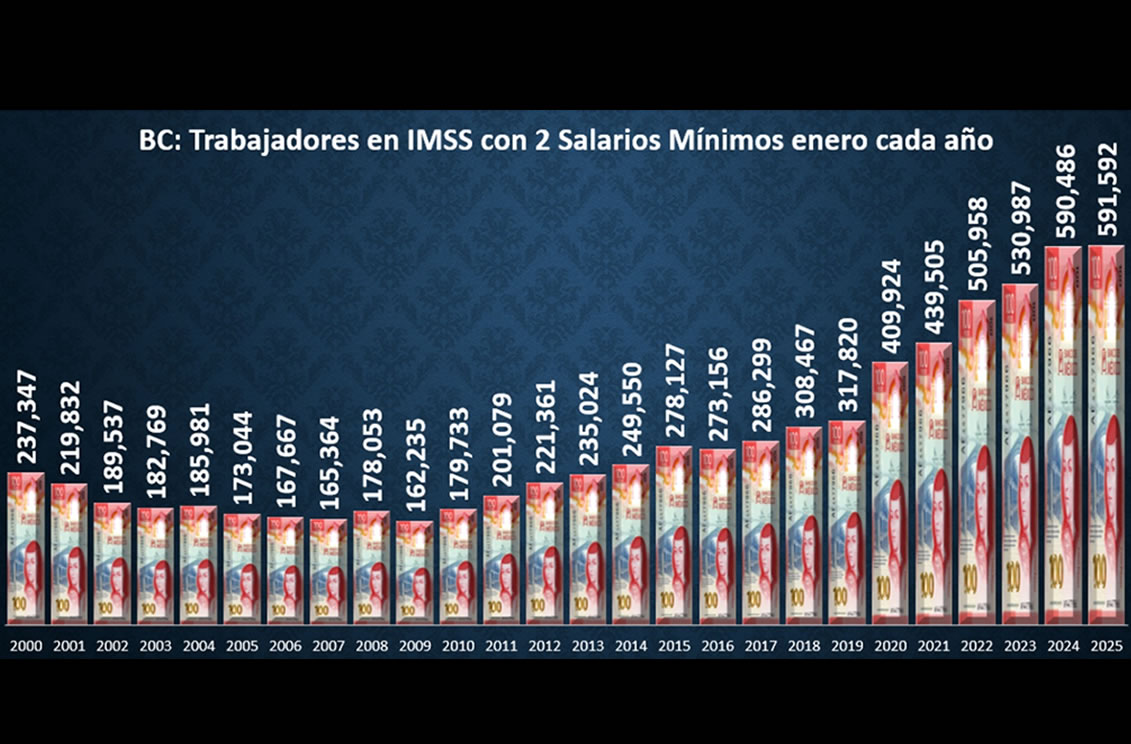 TIJUANA BC 1 DE MARZO DE 2025 (AFN).- En enero de 2025, el mercado laboral de Baja California documentó el mayor incremento de la historia en los trabajadores que ganan 2 Salarios Mínimos (SM) adscritos al Instituto Mexicano del Seguro Social (IMSS).