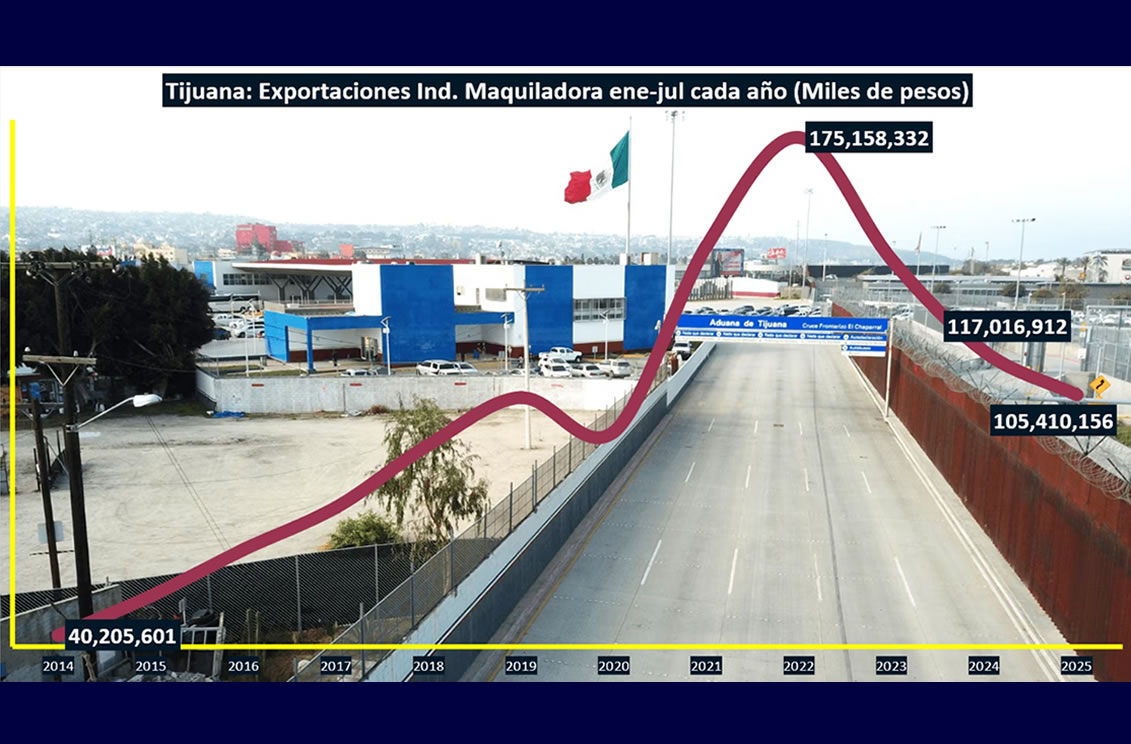 TIJUANA BC 30 DE SEPTIEMBRE DE 2025 (AFN).- Las exportaciones de la Industria Maquiladora en Tijuana documentaron una reducción del 9.9% a tasa anual en el acumulado enero a julio de 2025 respecto al comportamiento del mismo lapso de 2024, de acuerdo con los resultados que dio a conocer el Instituto Nacional de Estadística y Geografía (INEGI).