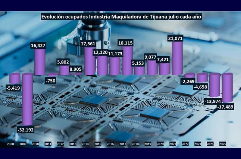 TIJUANA BC 1 DE OCTUBRE DE 2025 (AFN).- Los ocupados en la Industria Maquiladora en Tijuana reportaron una reducción del 7% a tasa anual durante julio del presente año en comparación al mismo lapso, pero del 2024, de acuerdo con las cifras que dio a conocer el Instituto Nacional de Estadística y Geografía (INEGI).