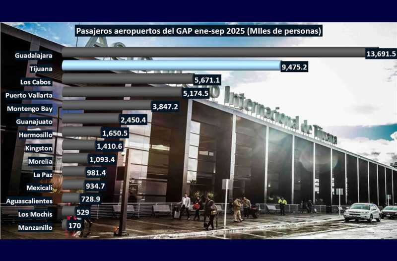 Asimismo, Tijuana se consolida como el segundo aeropuerto del GAP que reporta más flujo de pasajeros a los nueves meses de 2025, solo superado por Guadalajara que movilizó a poco más de 13 millones 691 mil personas.