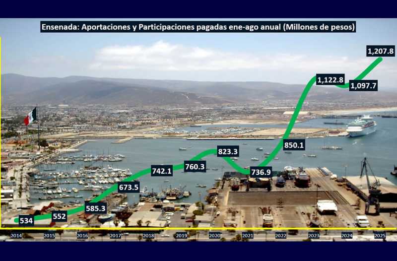 Con lo acumulado para la alcaldía de Ensenada, es decir, los Mil 207.8 millones de pesos de 2025, se registra el mayor monto de la historia en el pago de Aportaciones y Participaciones para el municipio en un lapso de enero a agosto de cada año.